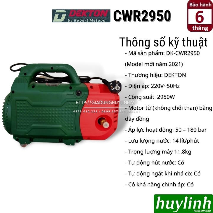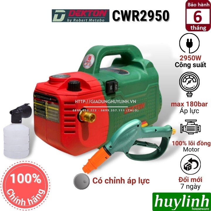 Máy rửa xe Dekton DK-CWR2950 ra mắt năm 2021 là dòng máy rửa xe chỉnh áp của thương hiệu Dekton với công suất hoạt động lớn 2950W, motor bằng cảm ứng từ lõi đồng bền bỉ.Huy Linh phân phối và bảo hành chính hãng tại Dekton Việt Nam