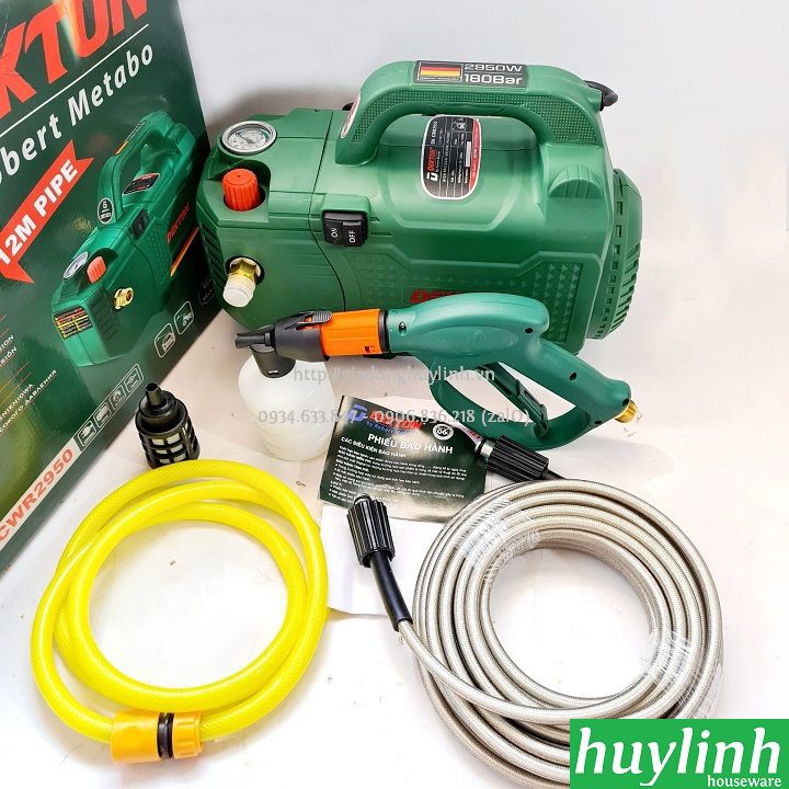 - Bộ sản phẩm của máy bao gồm: Thân máy (11.8kg), Dây cao áp 12 mét (Khách hang có thể mua thêm tại Huy Linh), Súng phun có chỉnh tia, Ống hút, lọc rác, bộ khớp nối đầu vào, bình phun bọt xà bong.