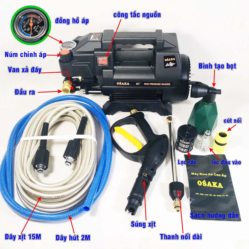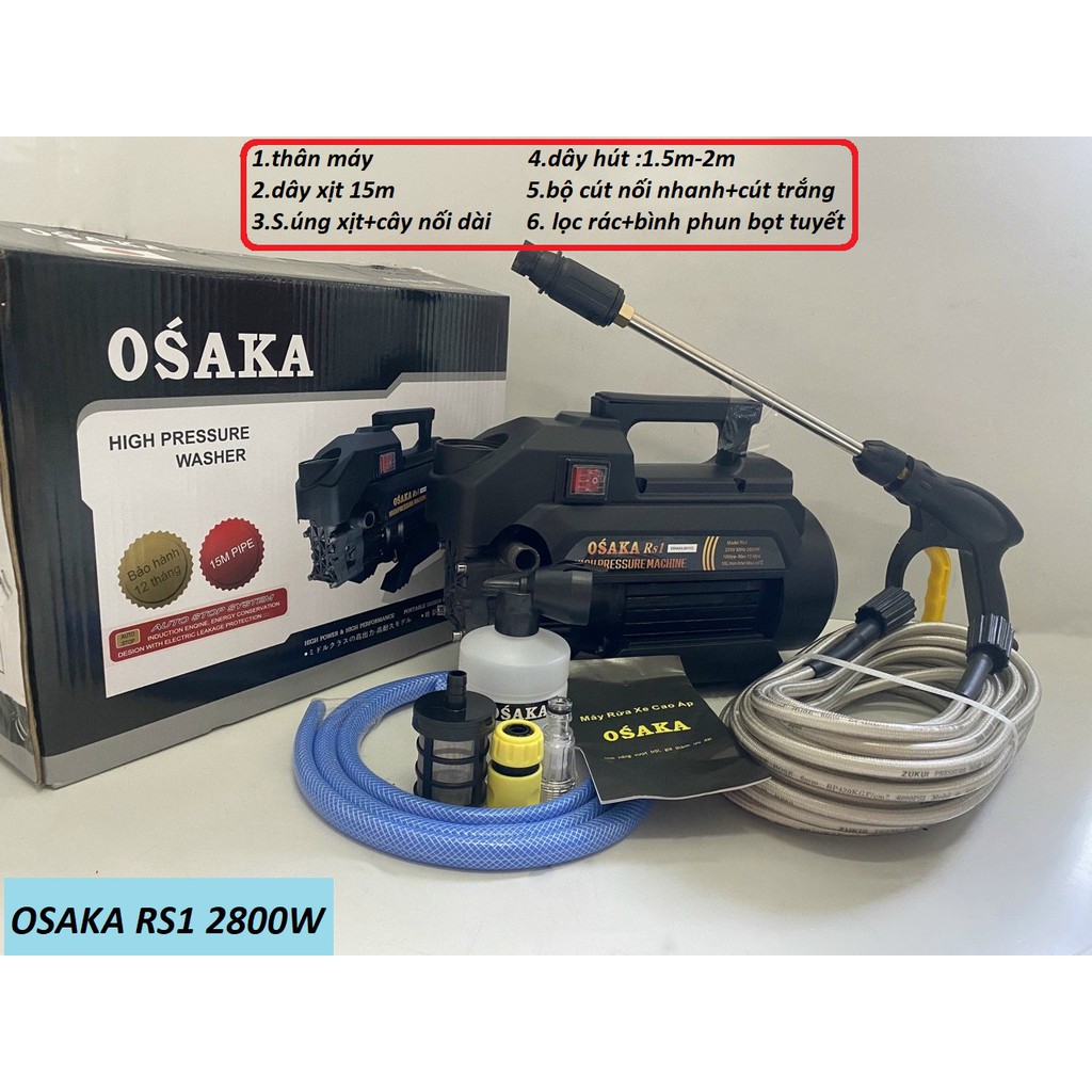 MÁY XỊT RỬA XE OSAKA là dòng máy xịt thông dụng, với áp lực nước bắn ra cực mạnh nên thường được dùng để rửa xe ô tô, xe máy, xịt rửa sân vườn, các mảng bám rong rêu lâu ngày, chuồng trại chăn nuôi, ...Mẫu 2021 về thêm dòng Osaka RS1 là phiên bản nâng cấp của dòng của Osaka V2 từ công suất 2400w lên tới 2800W, dây xịt dài tới 15m thoải mái.