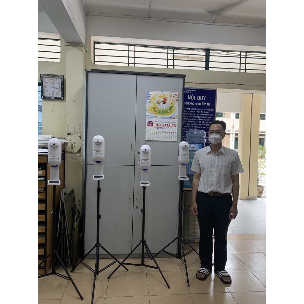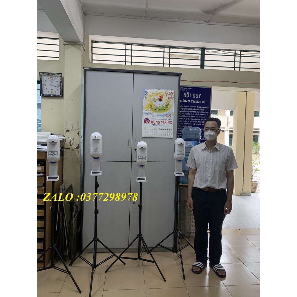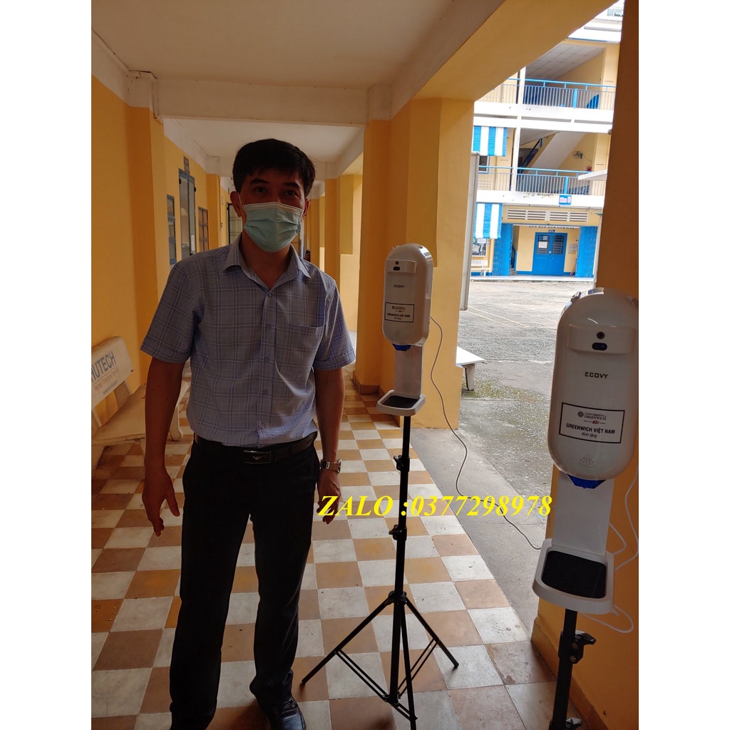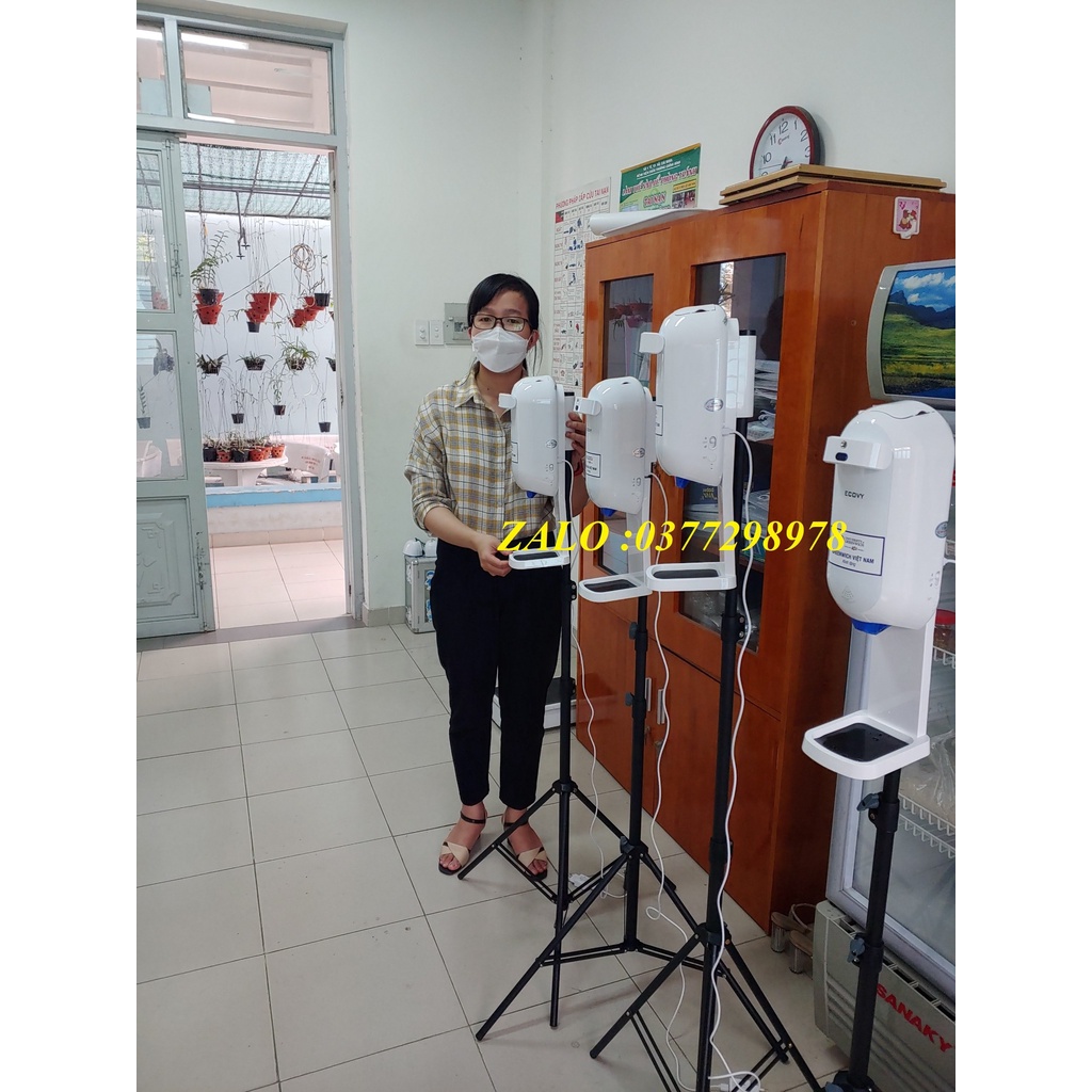 Bộ máy xịt cồn cảm ứng có đo nhiệt độ trán ECOVY L5 PLUS, Chân đứng 3 chân loại tốt.