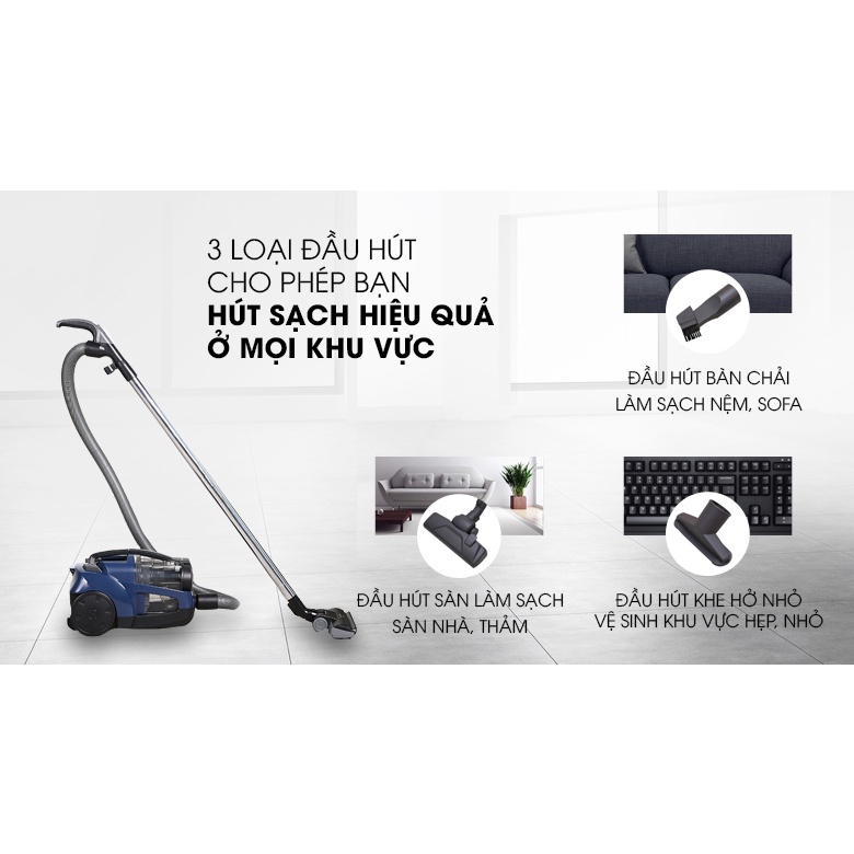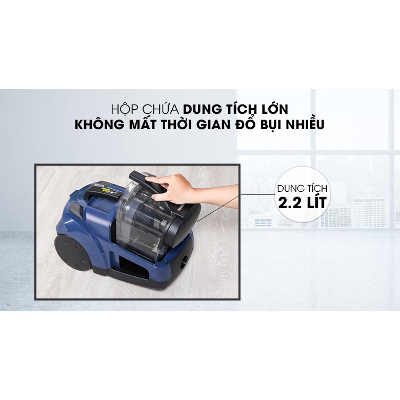 Máy có hộp chứa bụi dung tích lớn 2.2 lít, chứa được lượng bụi lớn, người dùng không cần phải đổ bụi nhiều lần, tiết kiệm thời gian, công sức