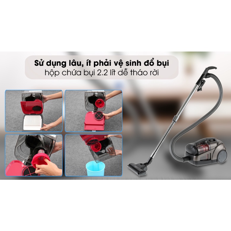 - Máy hút bụi dùng hộp chứa bụi có dung tích 2.2 lít chứa được nhiều bụi.