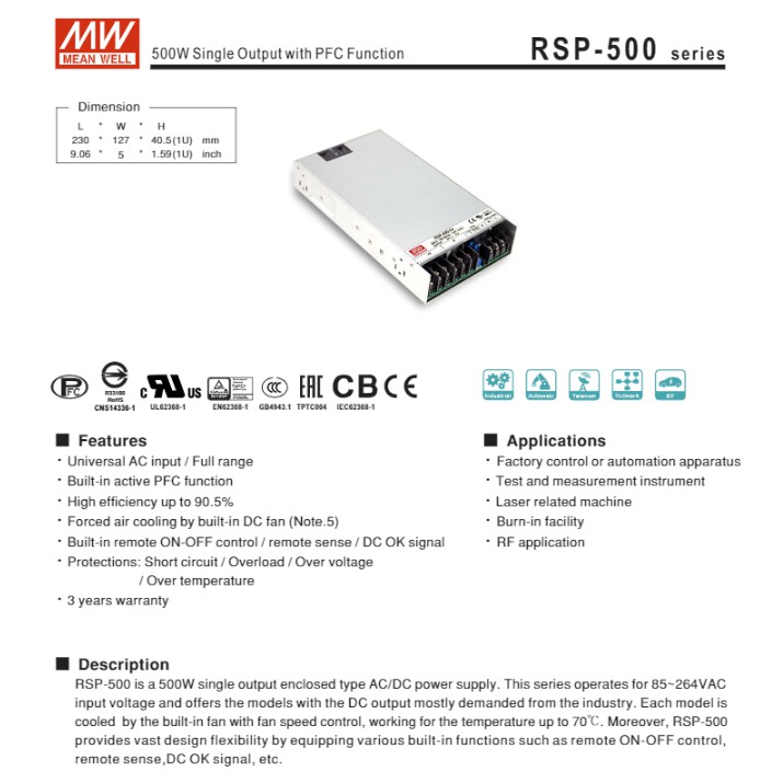 RSP-500 là nguồn cung cấp điện AC / DC đơn đầu ra 500W. Dòng sản phẩm này hoạt động với điện áp đầu vào 85 ~ 264VAC và cung cấp các kiểu máy có đầu ra DC chủ yếu được yêu cầu từ ngành công nghiệp. Mỗi mô hình được làm mát bằng quạt tích hợp với điều khiển tốc độ quạt, hoạt động ở nhiệt độ lên đến 70. Hơn nữa, RSP-500 ° C mang lại sự linh hoạt trong thiết kế bằng cách trang bị nhiều chức năng tích hợp khác nhau như điều khiển BẬT-TẮT từ xa, cảm biến từ xa, tín hiệu DC OK, v.v.