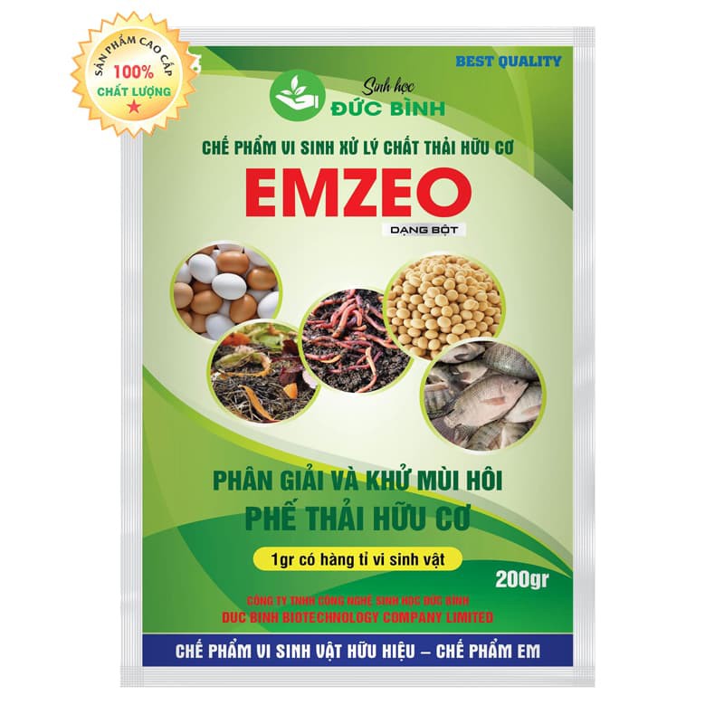 Chế phẩm vi sinh xử lý chất thải hữu cơ EMZEO dạng bột dùng để phân giải và khử mùi hôi phế thải hữu cơ. Với hàng tỷ sinh vật có lợi có trong 1gr, Emzeo còn tiêu diệt các vi sinh vật gây bệnh, chống ô nhiễm môi trường theo cơ chế sinh học.1. Xuất xứ: Công ty TNHH Công Nghệ sinh học Đức Bình.