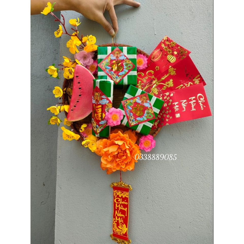 Giới thiệu Mẹt tre bánh chưng, bánh tét dưa hấu, hoa mai vàng, hoa mẫu đơn cam, trang trí tết, sẵn hàng ạ