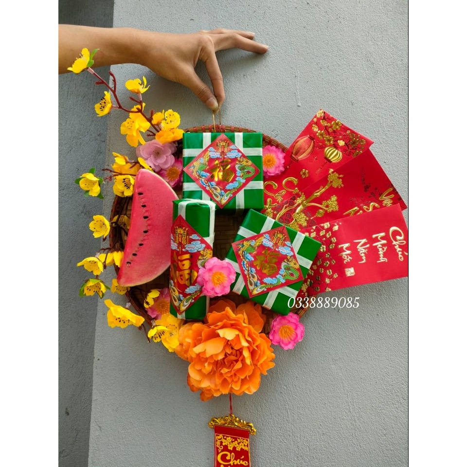 Mẹt tre bánh chưng, bánh tét dưa hấu, hoa mai vàng, hoa mẫu đơn cam, trang trí tết, sẵn hàng ạ