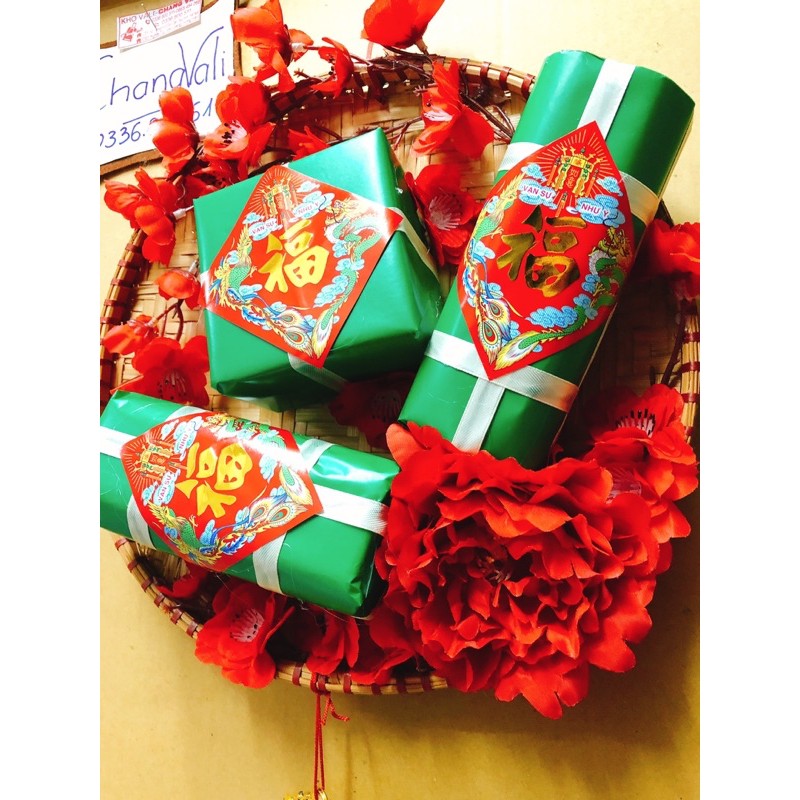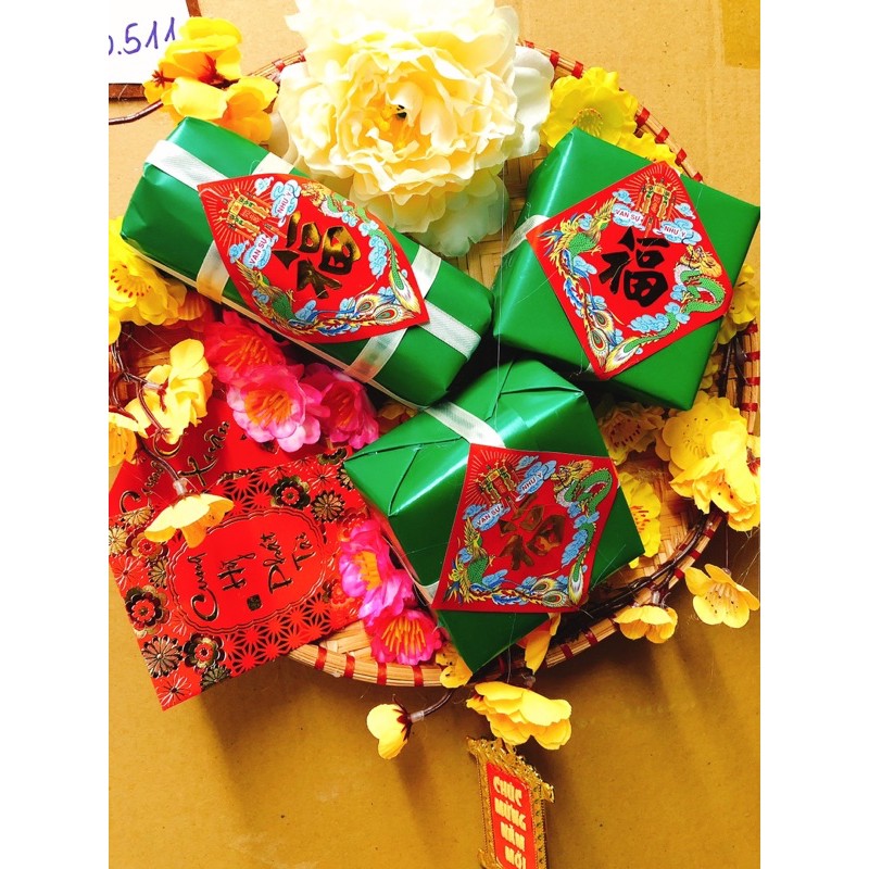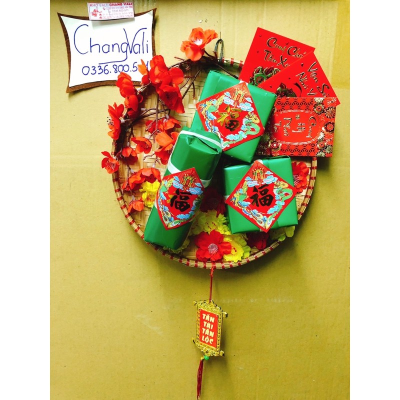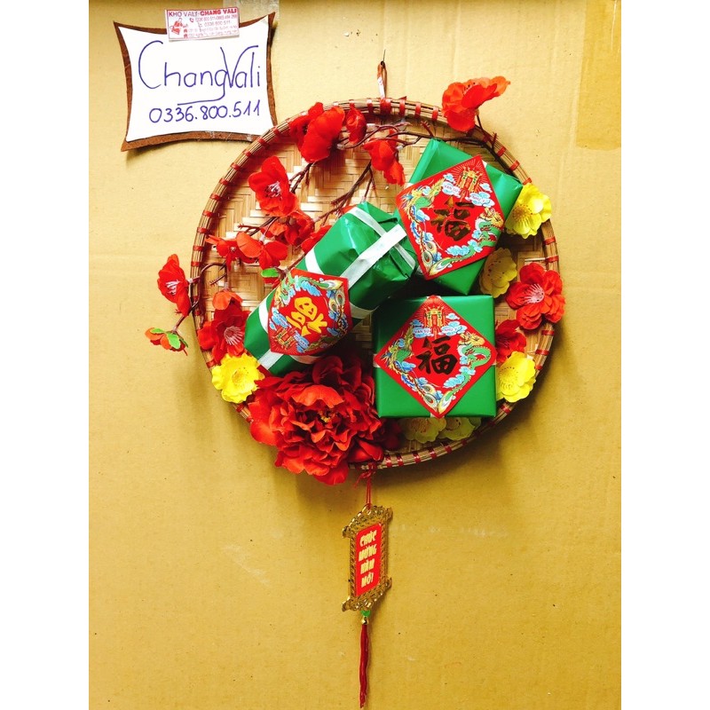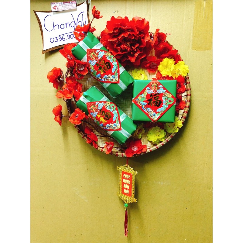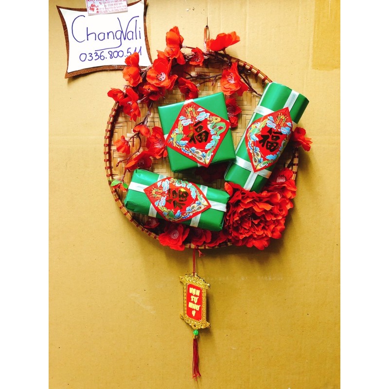 mẹt tre trang trí tếtmô hình bánh trưng bánh tét được trang trí trong mẹt cùng hoa mau hao đào siêu đẹp