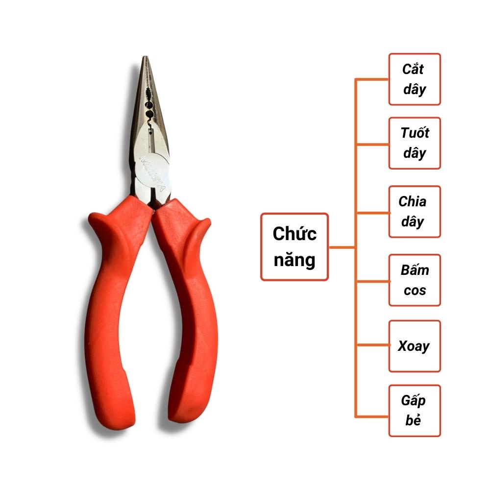 Kìm mỏ nhọn đa chức năng gồm: cắt dây, tuốt dây, bấm cố, chia dây, xoay, gấp bẻ...