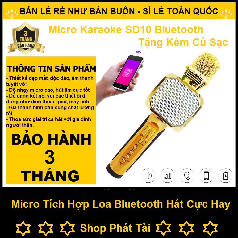 Micro SD-10 Bluetooth Hát Karaoke Kèm Loa ( ShopTặng Củ Sạc 3 Cổng Sạc USB ) bảo Đảm Hát HayMicro karaoke bluetooth SD10 đa năng kiêm loa không dây là phiên bản mới nhất của dòng micro Bluetooth Karaoke kèm loa SD đình đám trên thị trường. Đây là thiết bị giúp kết nối với điện thoại Smartphone thông qua sóng Bluetooth. Nhờ trang bị cả loa và mic trên cùng một sản phẩm nên chỉ cần mở một bản nhạc bất kì từ điện thoại là có thể phát trực tiếp ra loa, thỏa thích hát karaoke ngay tại chỗ với chất lượng âm thanh hay, to, rõ cực đỉnh.