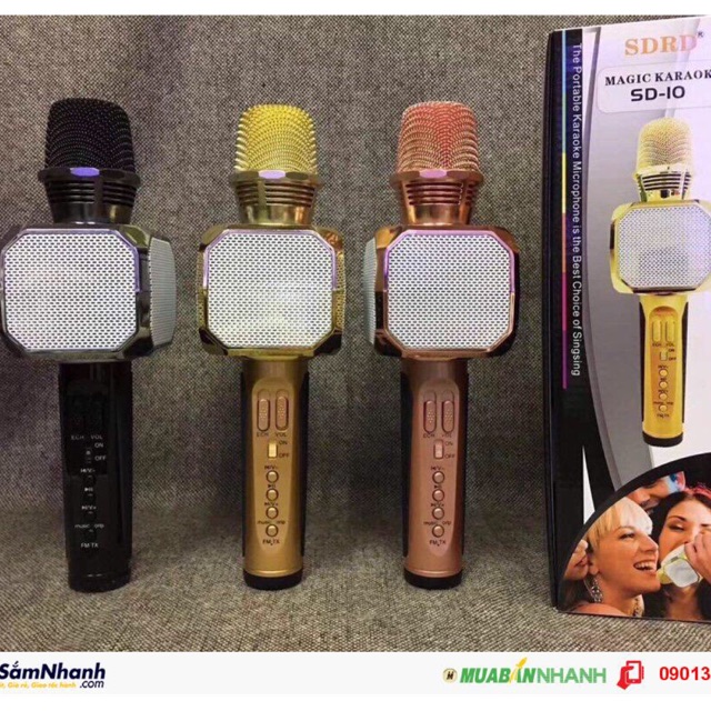 Micro hát karaoke SD-10 kèm loa BluetoothMic SD- 10 là phiên bản mới nhất của dòng micro Bluetooth Karaoke kèm loa SD đình đám trên thị trường. Đây là thiết bị giúp kết nối với điện thoại Smartphone thông qua sóng Bluetooth. Nhờ trang bị cả loa và mic trên cùng một sản phẩm nên chỉ cần mở một bản nhạc bất kì từ điện thoại là có thể phát trực tiếp ra loa, thỏa thích hát karaoke ngay tại chỗ với chất lượng âm thanh hay, to, rõ cực đỉnh.