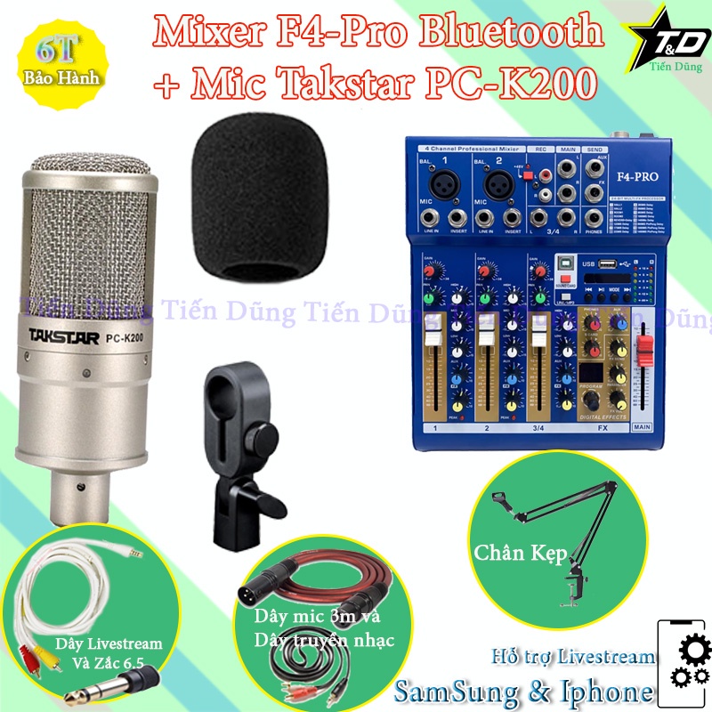 Bộ Mic Hát Livestream Mixer F4-PRO và Mic TAKSTAR PC K200⚡ Chân Đế Dây Livestream Chế Dây Truyền Nhạc Dây mic 3m zắc 6.5.🍀 TRỌN BỘ SẢN PHẨM MIC THU ÂM :