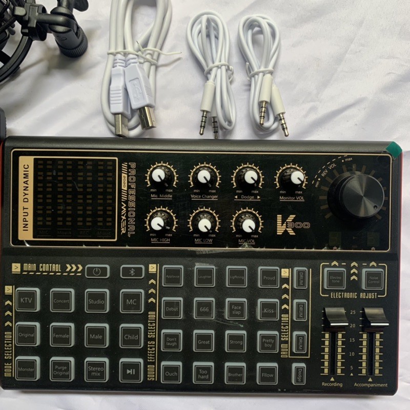 Sound card livestream K300 là chiếc Sound Card mạnh mẽ trong phân khúc được thiết kế tinh tế theo hơi hướng hiện đại cùng với đó là chất liệu nhựa cao cấp ABS điều chỉnh các phím được phân bố phù hợp, cùng với đó K300 tích hợp hệ thống đèn led LGB với nhiều màu sắc bắt mắt tạo điểm đặc biệt sản phẩm.Tùy chỉnh âm sắc từng cổng micro, nhạc cụ riêng biệt, hát trực tiếp bằng micro trên tai nghe điện thoại phổ thông, chế độ Auto-Tune hát hay hơn với nhiều tùy chỉnh tông nhạc theo bài hát.