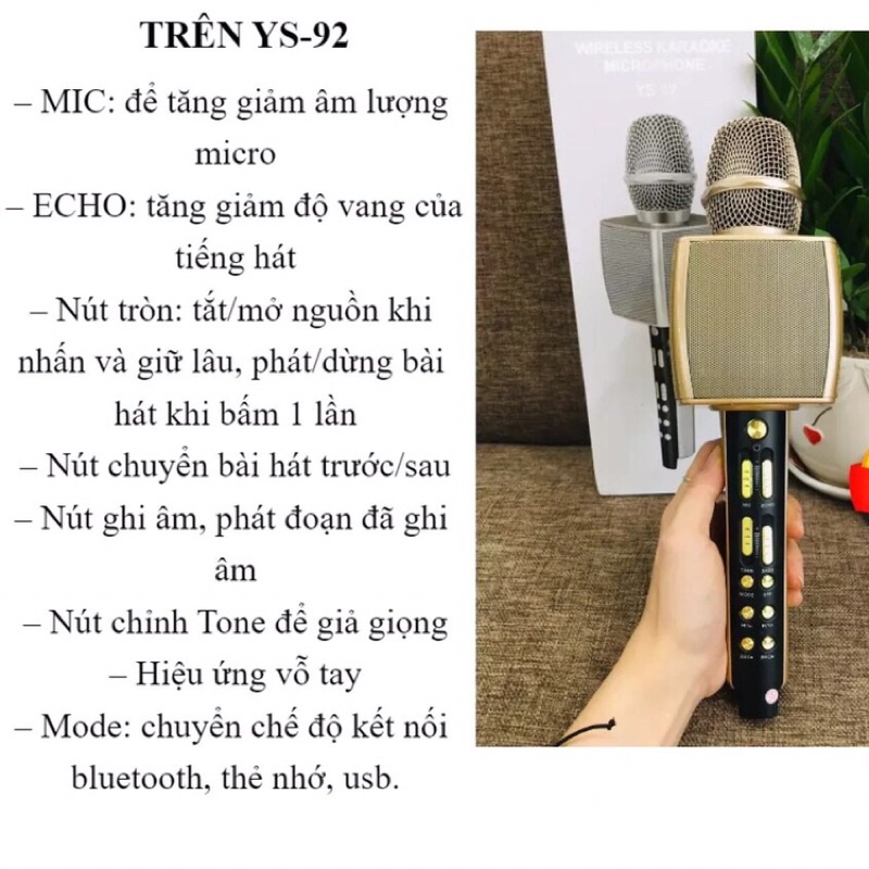 MIC KARAOKE BLUETOOTH YS 92 - MICRO CAO CẤP - LIVESTREAM - ÂM THANH SỐNG ĐỘNG - THẺ NHỚ - GHI ÂM