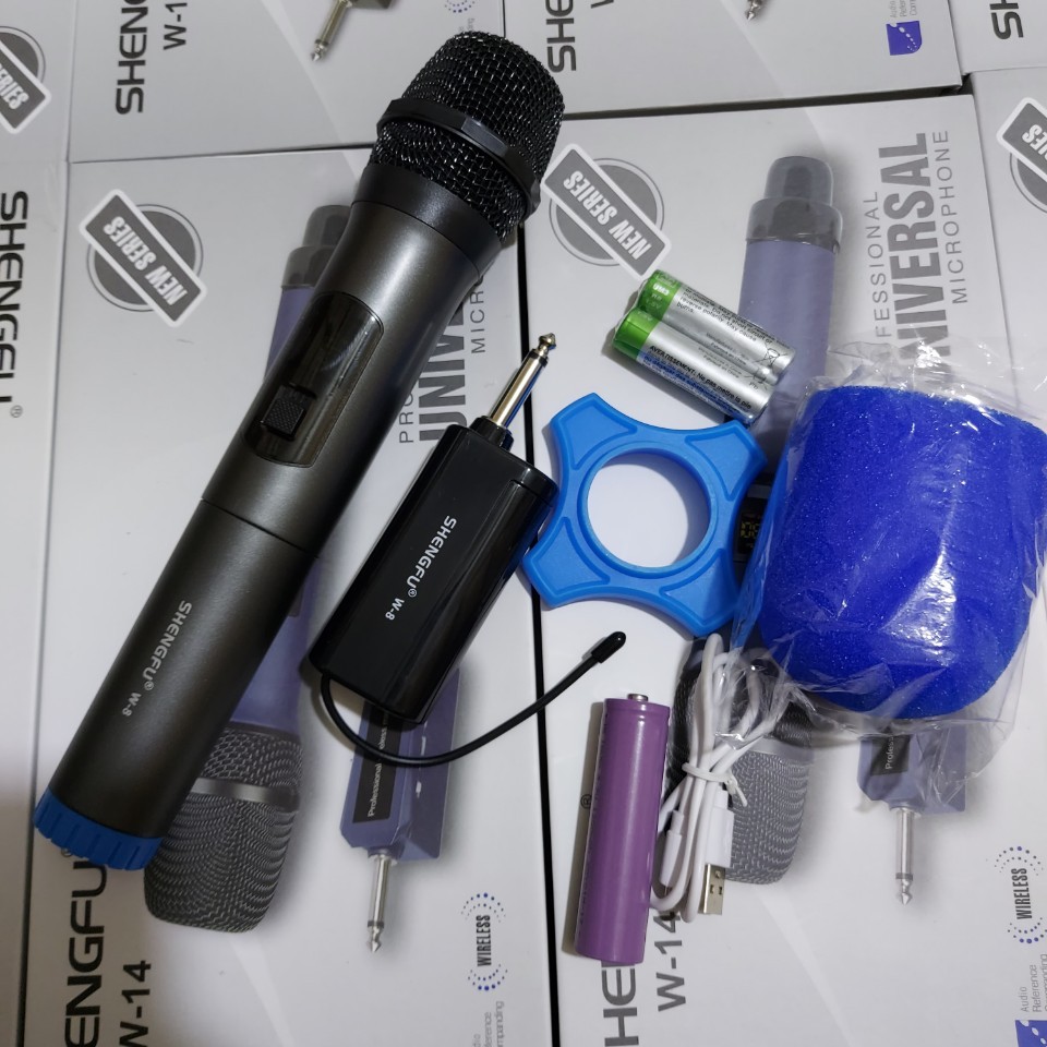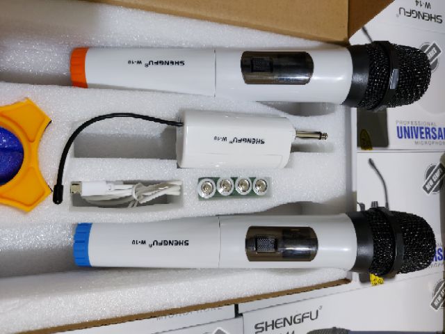 Mic karaoke đa năng Shengfu W-10 (2 mic) W8 (1 mic) M3-M4Dùng cho các loại đầu karaoke...đặc biệt thích hợp cho các loại loa kéo di động do không cần cắm nguồn điện trực tiếp mà xài pin sạc. Âm thanh xuất hay, ấm,...
