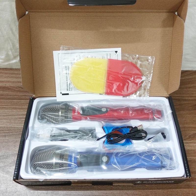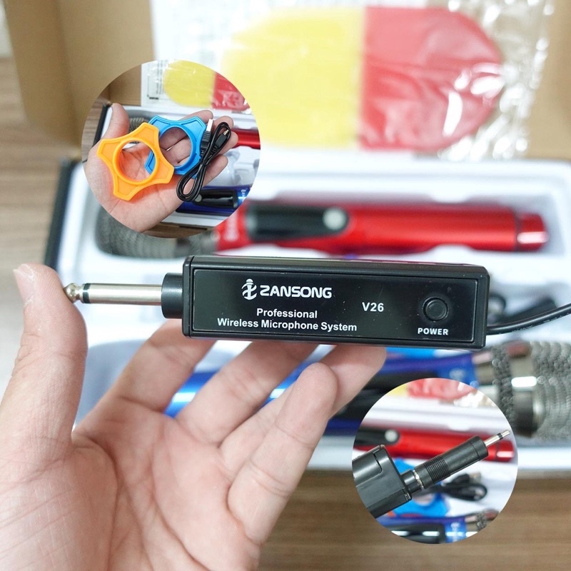 - Bộ sản phẩm gồm: 2 x Micro không dây karaoke cao cấp Zansong V26, 1 x Cục thu phát sóng, 1 x Dây sạc, 1 x Jack av, Tặng 2 x Chụp micro, 2 x Chống lắn, 3 x Pin sạc