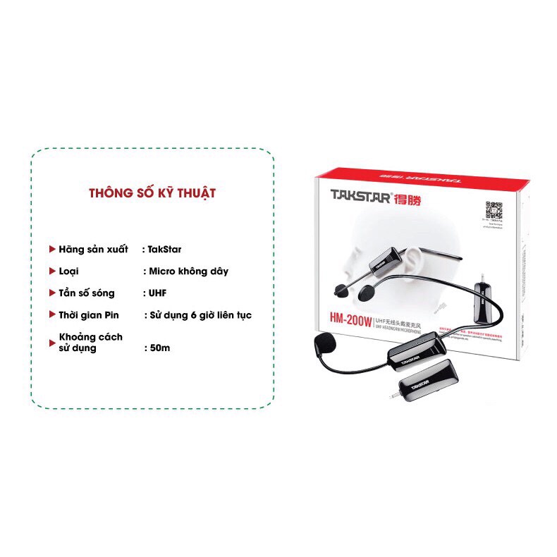 Mic không dây TAKSTAR HM 200W sóng UHF Headworn Microphone - mic không dây đeo tai bắt xa tới 50m sóng khỏe.Được sử dụng với bộ khuếch đại và loa kéo, loa trợ giảng, thiết bị livestream...
