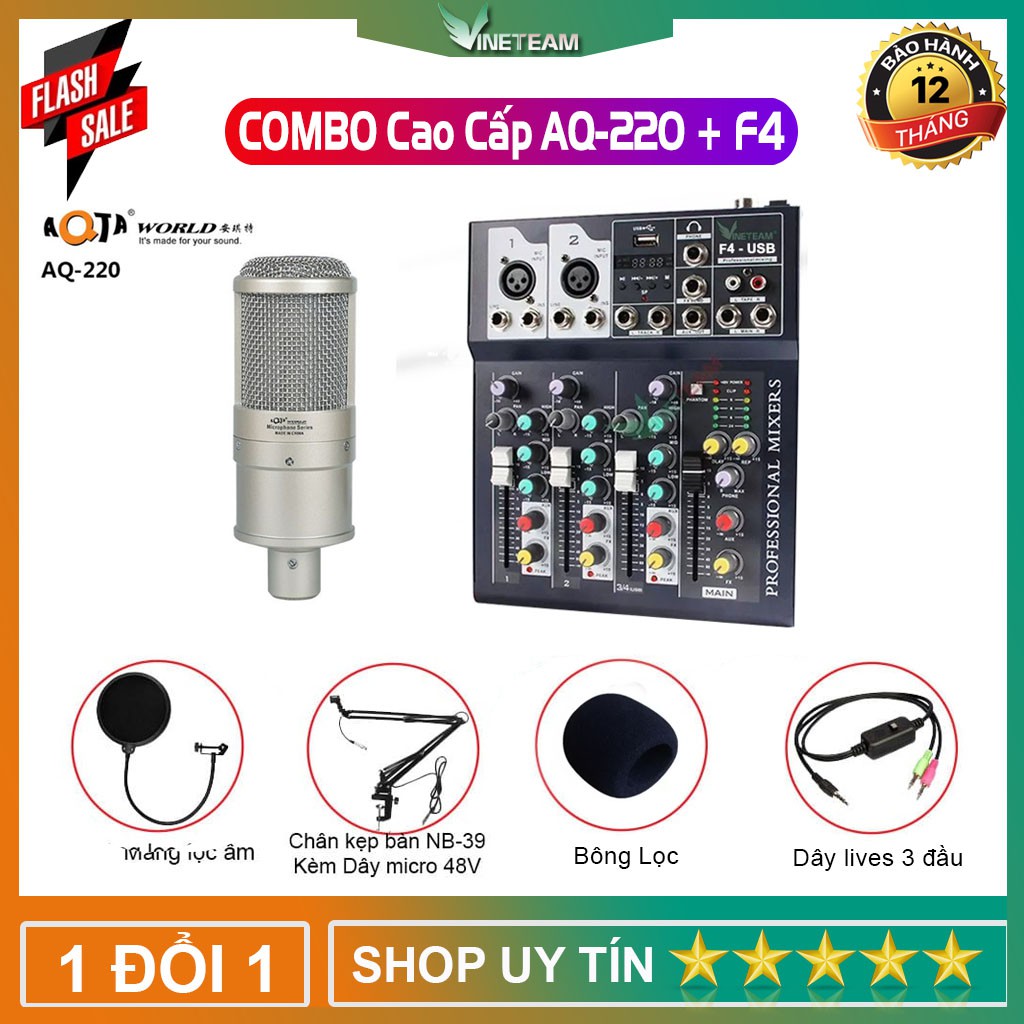 Mic thu âm AQ220 mixer Vinetteam F4 bluetooth dây live stream 3 ĐẦU ,chân kẹp,màng lọc,Jack 6.5 ra 3.51. GIỚI THIỆU BỘ THU ÂM AQ220 VÀ BÀN MIXER VINETTEAM F4 BLUETOOTH