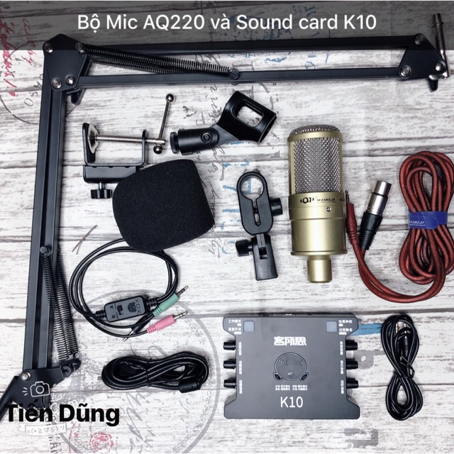 - Bộ mic thu âm Sound card K10 + Micro thu âm AQ220 là một combo thu âm ,live tream mini tại nhà dành cho tín đồ đam mê ca hát.Sound card k10 mà đi kèm với Micro AQ220 cho âm thanh chất lượng cãi tiến . Micro AQ220 được dùng bán chuyên ,có thể thu âm hát live tream.