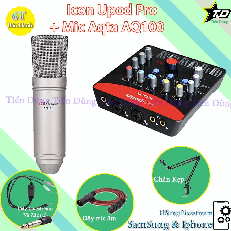 Mic Thu Âm Aqta AQ100 và Sound Card Icon Upod Pro Kèm Chân Kẹp Dây Livestream MA2 Dây Mic 3m Zắc 6.5 , Dây Truyền Nhạc