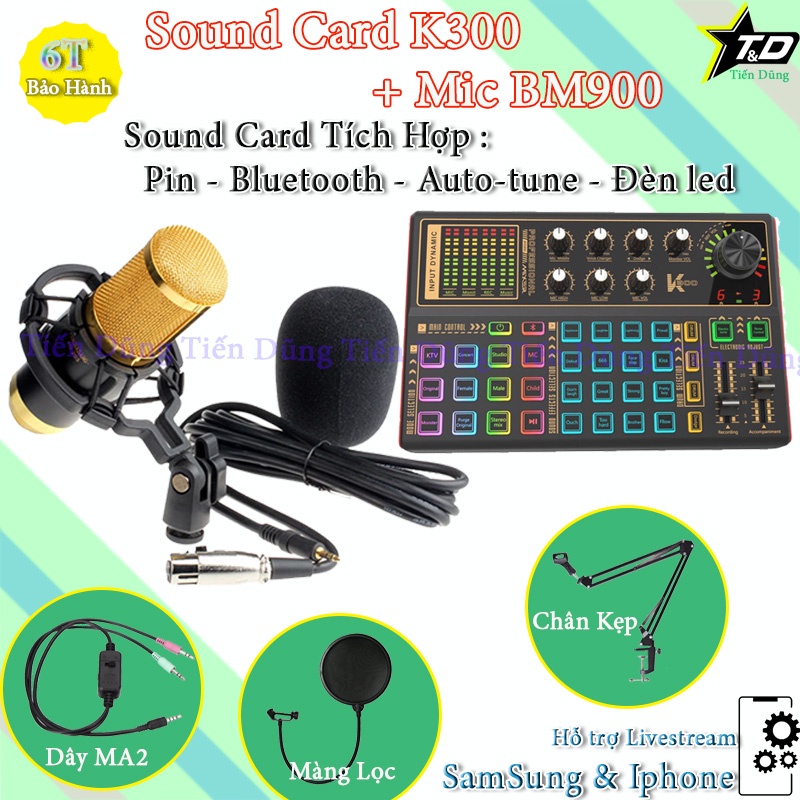 Bộ Mic thu âm BM900 sound card k300 có autu tune và bluetooth dây livestream MA2 chân kẹp màng lọc