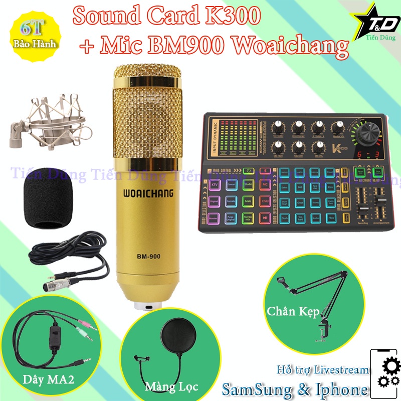 Bộ Mic thu âm BM900 Woaichang sound card k300 có autu tune và bluetooth dây livestream MA2 chân kẹp màng lọc