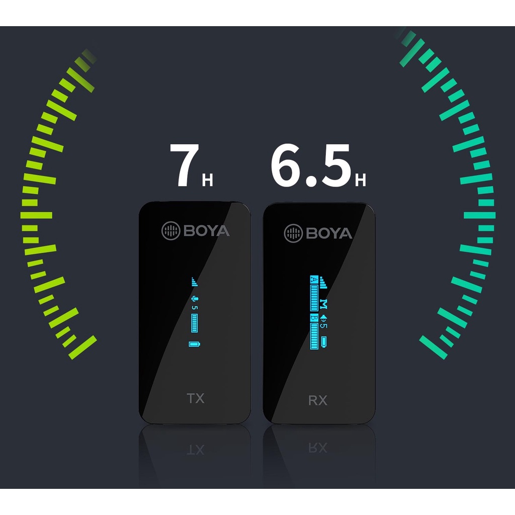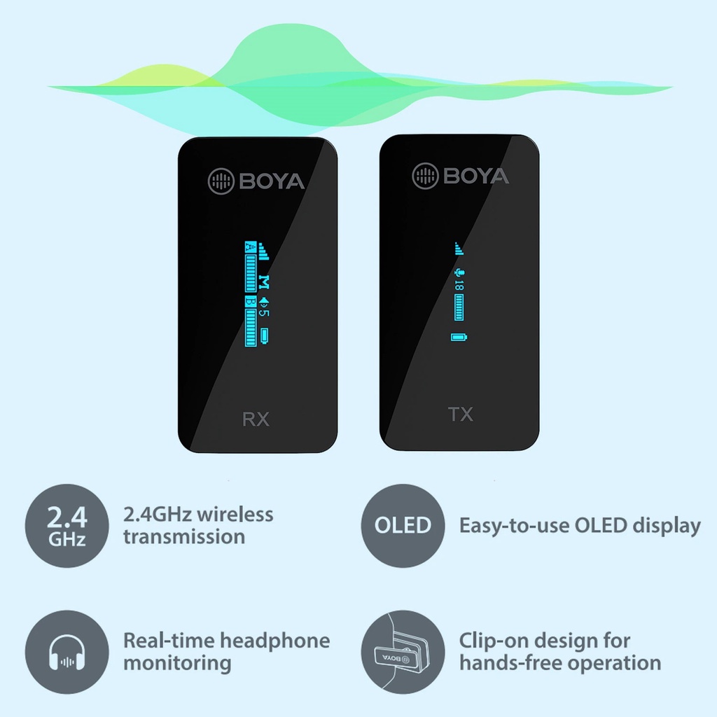 BOYA BY-XM6-S1, một hệ thống micrô không dây nhảy tần thích ứng 2,4GHz, bao gồm một bộ phát và một bộ thu. Đây là giải pháp thu và phân phối âm thanh hoàn hảo cho vlog của một người, video YouTube, phát trực tiếp, phỏng vấn, ghi âm, v.v.