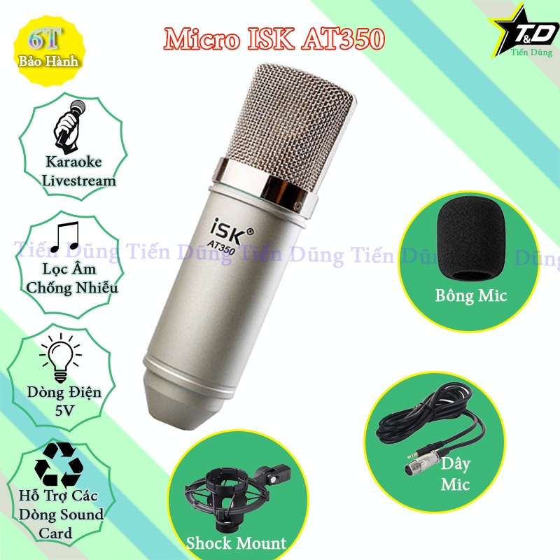 - Micro thu âm Micro Isk AT350 được cung cấp bỡi hàng isk (một hãng microphone thu âm nỗi tiếng tại China. Tên micro gắn liền với tên tuổi của các ca sĩ .Micro là dòng dynamic 5v rất dễ sd có thể kết hợp mọi loại sound card như sound card v8,sound card v9,sound card v10,sound card v11,sound card 12,sound card k10,sound card h9,sound card hf5000,sound card icon upod pro......vvv