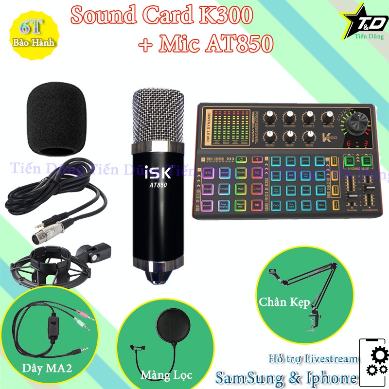 Bộ Mic thu âm ISK AT850 sound card k300 dây livestream MA2 chân kẹp màng lọc sound card k300 có autu tune và bluetooth.1. TRỌN BỘ SẢN PHẨM THU ÂM ISK AT850 SOUND CARD K300