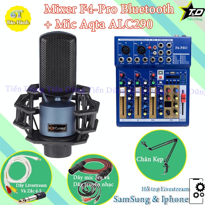 Bộ Mic Thu Âm Livestream Mixer F4 PRO và Mic Aqta ALC290 Chân Đế Dây Livestream Chế Dây Truyền Nhạc Dây mic 3m zắc 6.5.