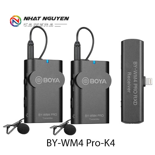 BOYA BY-WM4 PRO-K4 - BẢO HÀNH 12 THÁNGlà hệ thống micro không dây 2.4GHz, được thiết kế đặc biệt cho các thiết bị Lightning iOS, đi kèm với hai bộ phát (TX4 Pro) và một máy thu nhỏ có đầu nối Lightning (BY-WM4 PRO RXD) và hai micrô lavalier đa hướng.