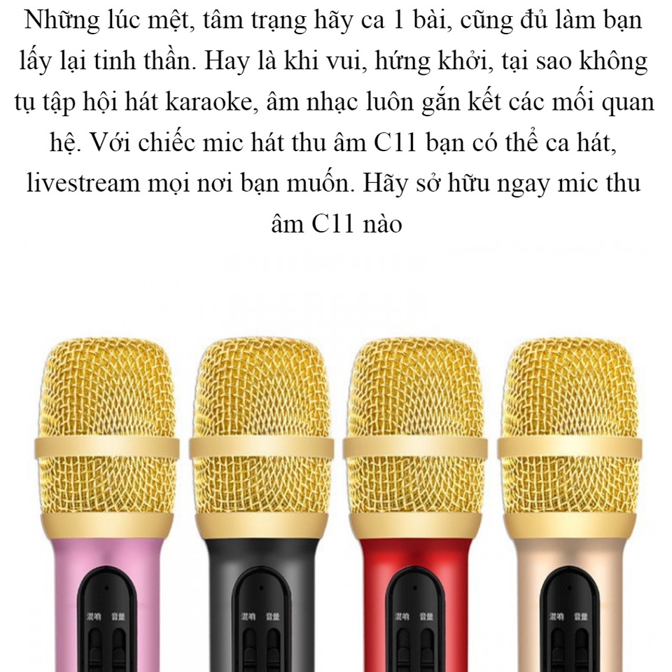 – Ưu điểm đáng chú ý và cũng là điểm nhấn của chiếc mic C11 này là giá hạt rẻ nhưng âm thanh thu tốt rõ ràng, độ vang nhại tốt hát karaoke hay