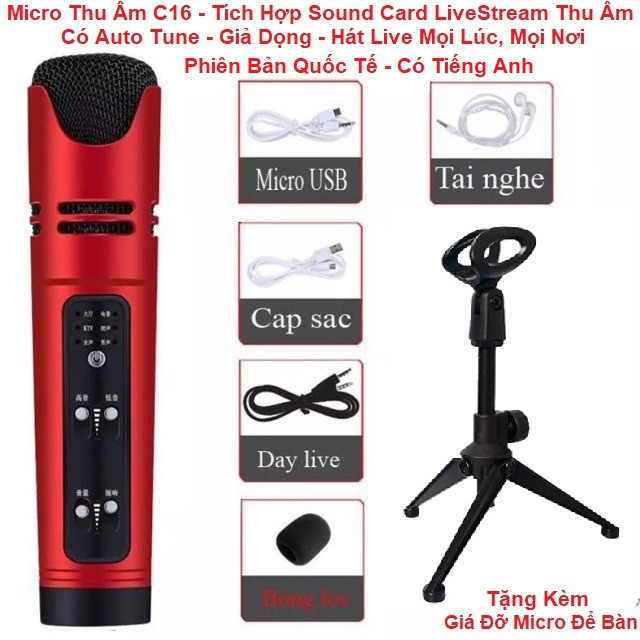 Micro C16 Tích Hợp Sound Card Chuyên Thu Âm, Live Stream, Karaoke Oline, Tặng Kèm Giá Đỡ Micro Để Bàn