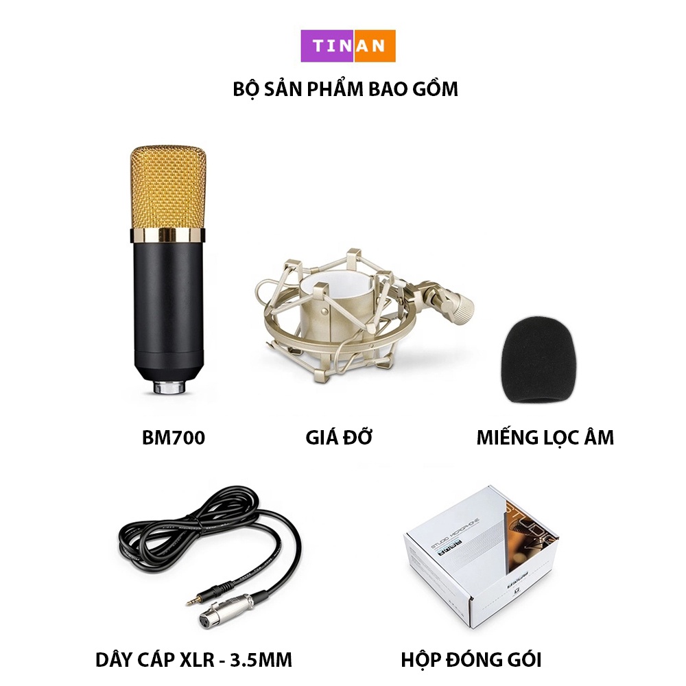 1*Cáp âm thanh 3.5mm (3 khấc), 1*Giá đỡ micro, 1*Miếng lọc âm, 1*Micro BM700, 1*Hộp