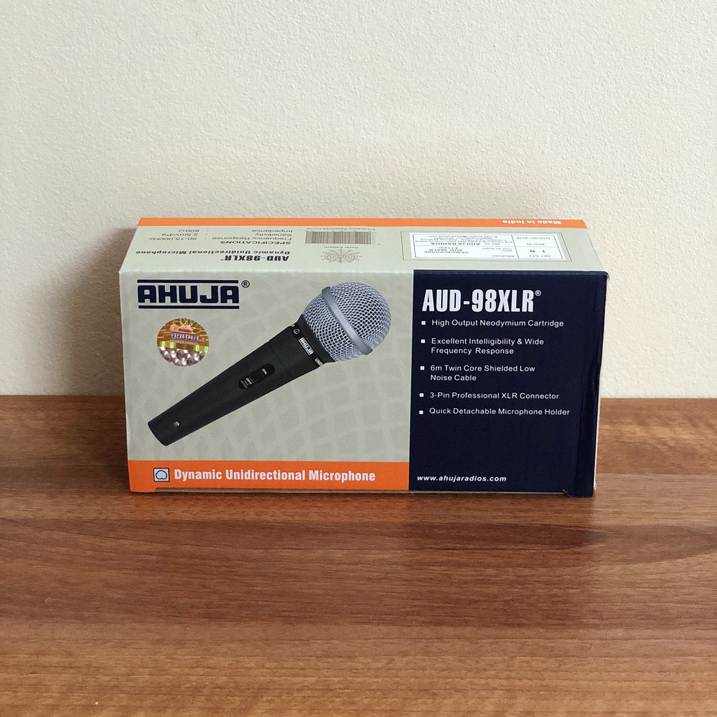 - Trọn bộ sản phẩm bao gồm: Micro AHUJA AUD-98XLR, dây micro, bao đựng micro, giá nhựa.