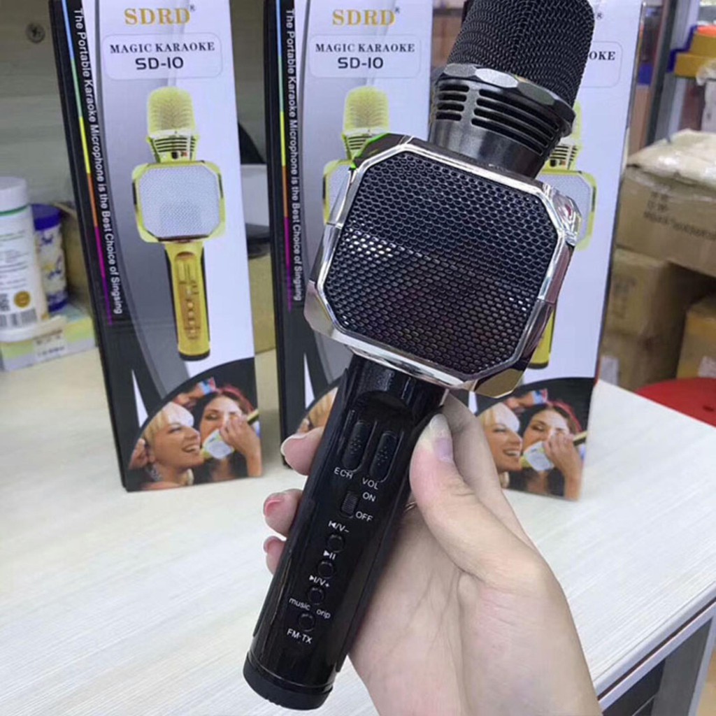 Micro Bluetooth Karaoke Không Dây SD10 Đa Năng chỉnh giọng ghi âm tích hợp kèm loa - hàng chính hãngMicro Bluetooth Karaoke SD10 đa năng là phiên bản mới nhất của dòng micro bluetooth karaoke trên thị trường. Đây là thiết bị giúp kết nối với điện thoại Smartphone thông qua sóng Bluetooth. Nhờ trang bị cả loa và mic trên cùng một sản phẩm nên chỉ cần mở một bản nhạc bất kì từ điện thoại là có thể phát trực tiếp ra loa, thỏa thích hát karaoke ngay tại chỗ với chất lượng âm thanh hay, to, rõ cực đỉnh.