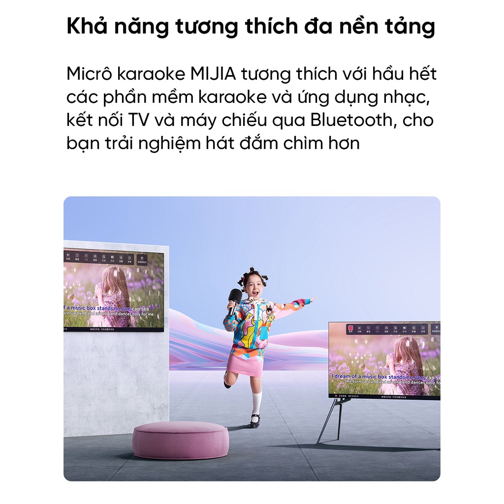 Micrô karaoke MIJIA K tương thích với hầu hết các phần mềm karaoke và ứng dụng nhạc, kết nối TV và máy chiếu qua Bluetooth, cho bạn trải nghiệm hát đắm chìm hơn.