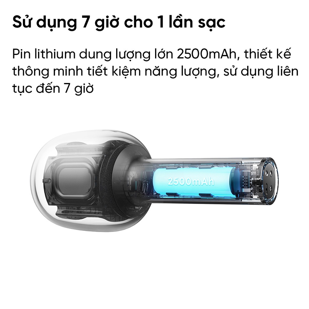 Pin lithium dung lượng lớn 2500mAh, thiết kế thông minh tiết kiệm năng lượng, sử dụng liên tục đến 7 giờ