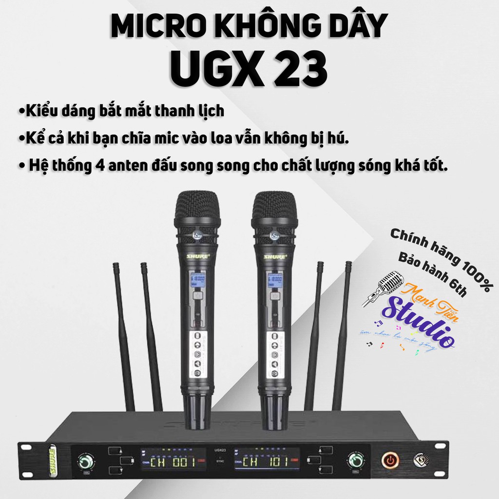 Giới thiệu sản phẩm micro Sh.ure UGX 23 - 4 râuMicro không dây SHU.RE UGX 23 là phiên bản nâng cấp mới nhất của hãng SH.URE trong năm 2020 này, với sự nâng cấp về thiết kế và tính năng nổi trội so với các mã UGX 21, UGX 20, UGX 10, UGX 9 và UGX 8. Đây là dòng micro hát hay trong tầm tiền, được nhiều gia đình và quán hát ưa chuộng lựa chọn có mặt trong bộ dàn karaoke.
