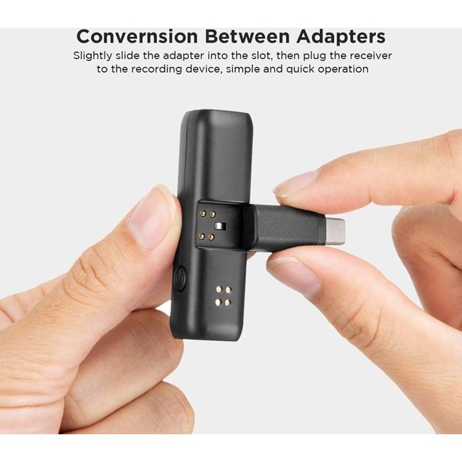 – Bộ thu plug-in thu nhỏ đi kèm với một bộ ba bộ điều hợp âm thanh, cho phép bạn kết nối nó với hầu như bất kỳ thiết bị ghi âm nào — không cần cáp hoặc kẹp.