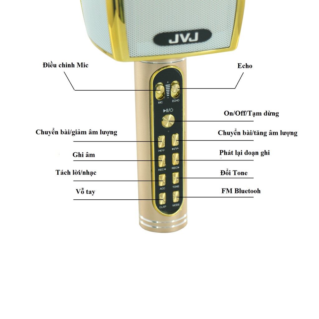 - Mic Karaoke Bluetooth JVJ YS-91 khắc phục được nhược điểm là tiếng loa bị rè, vỡ âm hay loa đột nhiên rú lên khi vô tình ma sát vào vòm mic. Các nút điều chỉnh chức năng được sắp xếp hợp lý thuận tiện sử dụng hơn khá nhiều.
