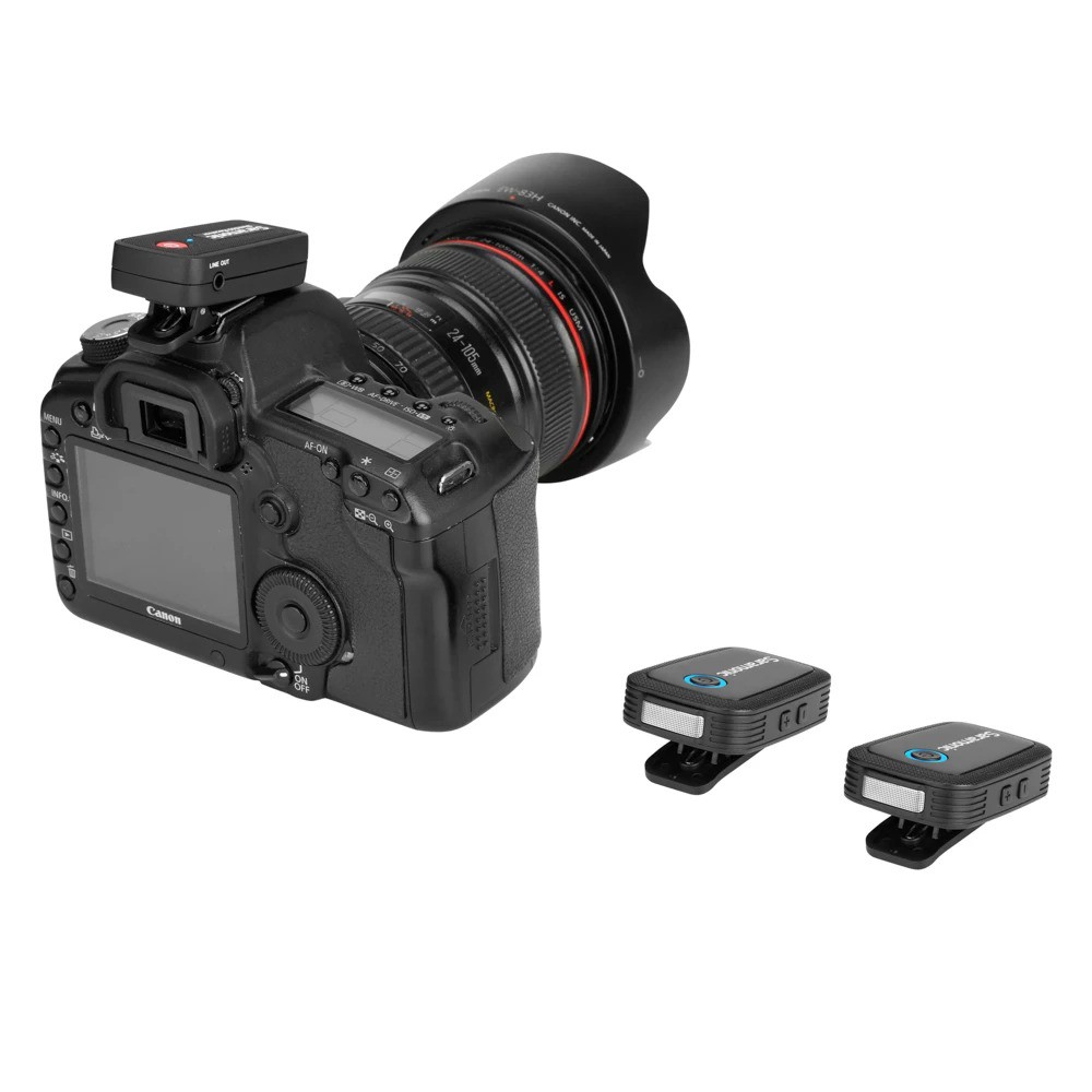 Saramonic Blink 500 B2(TX+TX+RX) gồm 2 bộ phát và 2 mic cài áo, do đó bạn có thể cài mic lên 2 người khác nhau mà chỉ cần một bộ thu cực nhỏ gọn duy nhất trên máy ảnh.