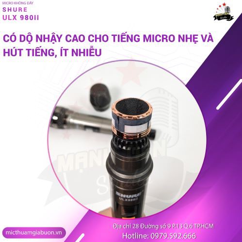 Micro Shure ULX980II được đánh giá cao khi sử dụng trong ca hát, chơi âm thanh cao cấp. Micro không dây Shure ULX980II nhanh chóng được ưu chuộng khi vừa mới ra mắt tại thị trường vì chất lượng hoàn toàn thuyết phục người nghe, có ấn tượng ngay từ ban đầu cho những ai đam mê thưởng thức một giọng hát hay. Là công cụ hiệu quả nhất cho một giọng ca đẳng cấp thể hiện. Thích hợp Quán Bar, club micro karaoke, hát với nhau.