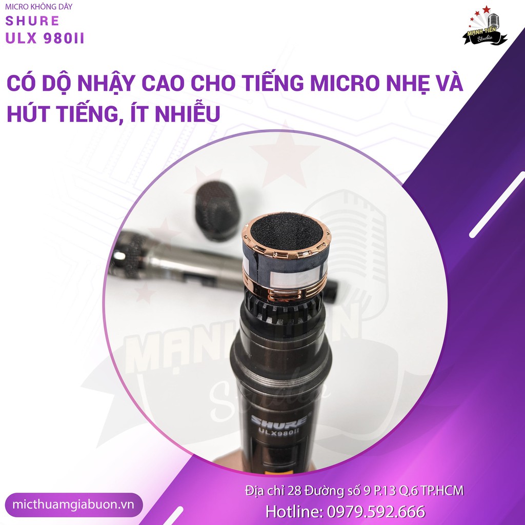 Micro Shure ULX980II được đánh giá cao khi sử dụng trong ca hát, chơi âm thanh cao cấp. Micro không dây Shure ULX980II nhanh chóng được ưu chuộng khi vừa mới ra mắt tại thị trường vì chất lượng hoàn toàn thuyết phục người nghe, có ấn tượng ngay từ ban đầu cho những ai đam mê thưởng thức một giọng hát hay. Là công cụ hiệu quả nhất cho một giọng ca đẳng cấp thể hiện. Thích hợp Quán Bar, club micro karaoke, hát với nhau.