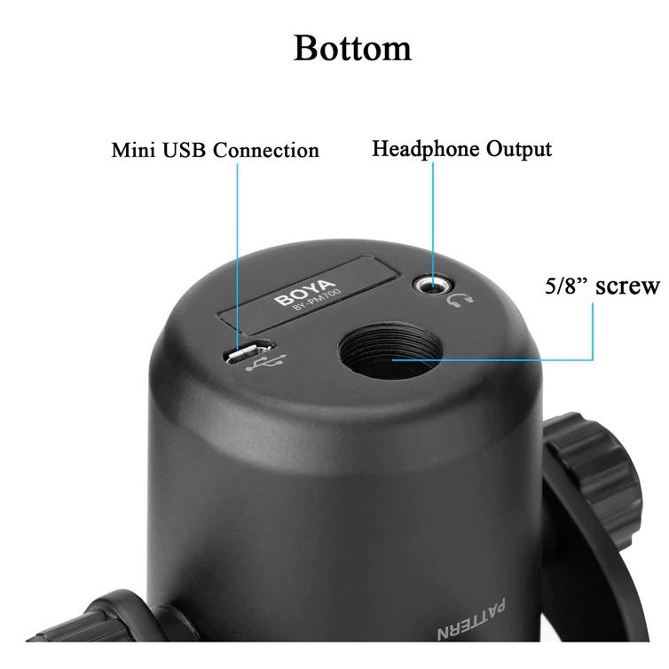 Micro thu âm Boya BY-PM700 là dòng microphone cổng cắm USB, tương thích với máy tính hệ thống Windows và Mac. Với mô hình núm, cho phép bạn lựa chọn chế độ omni-directional, cardiod, âm thanh stereo và bi-derectional pickup, phù hợp trong nhiều trường hợp như ghi âm, cuộc phỏng vấn, hội nghị, thu âm giọng hát, podcasting và nhiều hơn nữa. Độ phân giải lên đến 16 bit/48 khz, và nó có tính năng điều khiển, nút mute, không có độ trễ đầu ra headphoneTHÔNG SỐ KỸ THUẬT