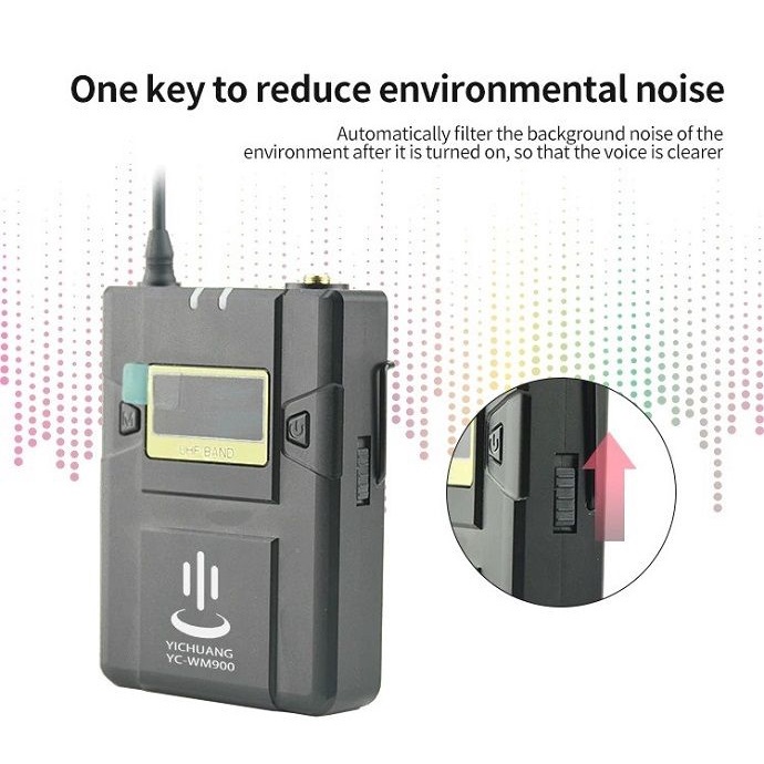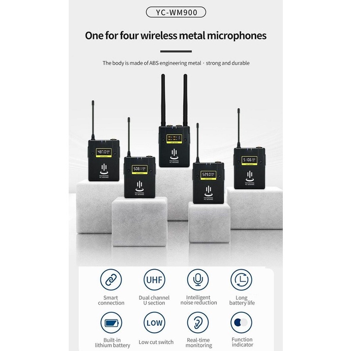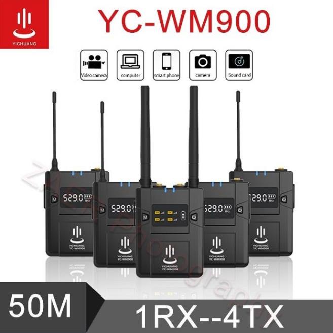 Micro thu âm cài áo 4 người YC-WM900 là dòng micro mới nhất 2021 của hãng sản xuất Yichuang dành cho máy ảnh máy quay hoặc điện thoại với khoảng cách thu xa lên đến 50m không có vật cản. Là dòng micro thế hệ mới lý tưởng cho các cuộc phỏng vấn, sản xuất blog video với kích thước nhỏ gọn dễ sử dụng với pin lithium tích hợp cho thời gian lên đến 7-8h liên tục. Ngoài ra micro YC-WM900 được trang bị màn hình led hiển thị tần số cũng như dung lượng pin một cách trực quan nhất.THÔNG SỐ KỸ THUẬT MICRO YC-VM900: