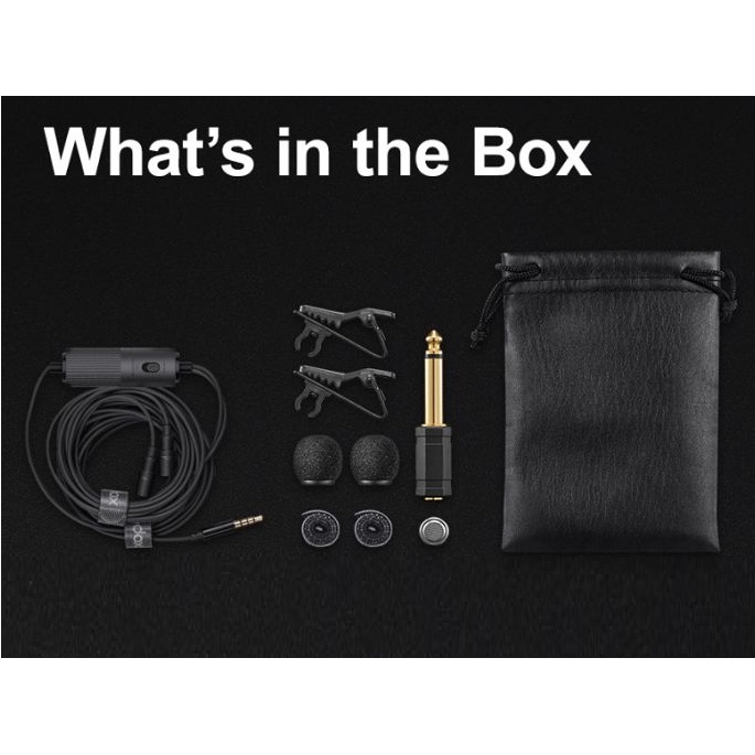 Nguồn điện được cung cấp bởi điện thoại thông minh của bạn hoặc bởi pin LR44 đi kèm nếu bạn đang ghi vào máy ảnh. Hai bông lọc gió bằng xốp để giảm tiếng ồn của gió được cung cấp. Hai kẹp ve áo và hai miếng băng dính để gắn mic vào quần áo cũng được bao gồm, cùng với một túi đựng nhỏ gọn.