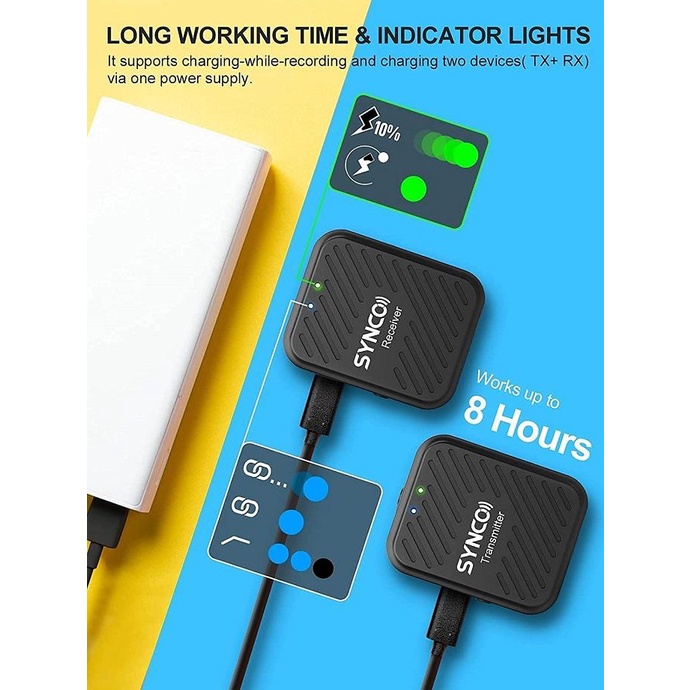 SYNCO G1 (A2) đạt được sự phù hợp tín hiệu chất lượng cao ở khoảng cách xa (Line-of-Sight: 164ft / 50m) nhờ công nghệ 2.4GHz và thuật toán SyncoderTM. Ngay cả khi có chướng ngại vật ở giữa, nó vẫn có sẵn 98ft / 30m. Điều này làm cho nó trở thành micrô lavalier không dây tốt nhất cho video, phim, youtube, v.v. Nếu bạn cần khoảng cách xa hơn, G1 (A1) với 230ft / 70m (LOS) và 131ft / 40m (NLOS) là một lựa chọn.