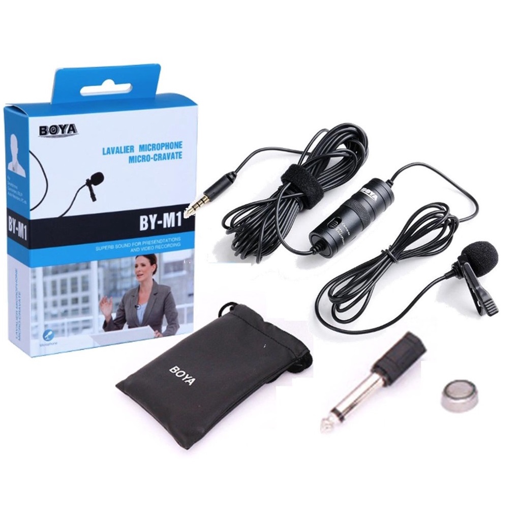 - Bộ sản phẩm đầy đủ : 1 x Micro BOYA BY-M1,01 x Dây nối dài 6M, 01 x pin LR44,1 x túi đựng da, 1x jack âm thanh 3.5 mm , 1x jack âm thanh 6.5 mm
