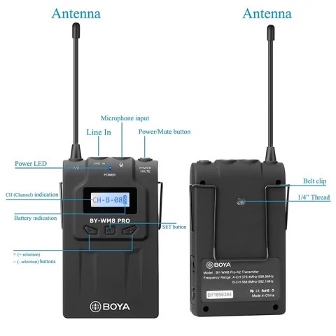 - Bộ Micro BOYABY-WM8 Pro-K1 này gồm 1 bộ phát (Transmitter) và 1 bộ nhân (Receiver) với số kênh lên tới 48 kênh nên bạn sẽ không lo bị trùng kênh với các thiết bị khác được sử dụng cùng lúc.