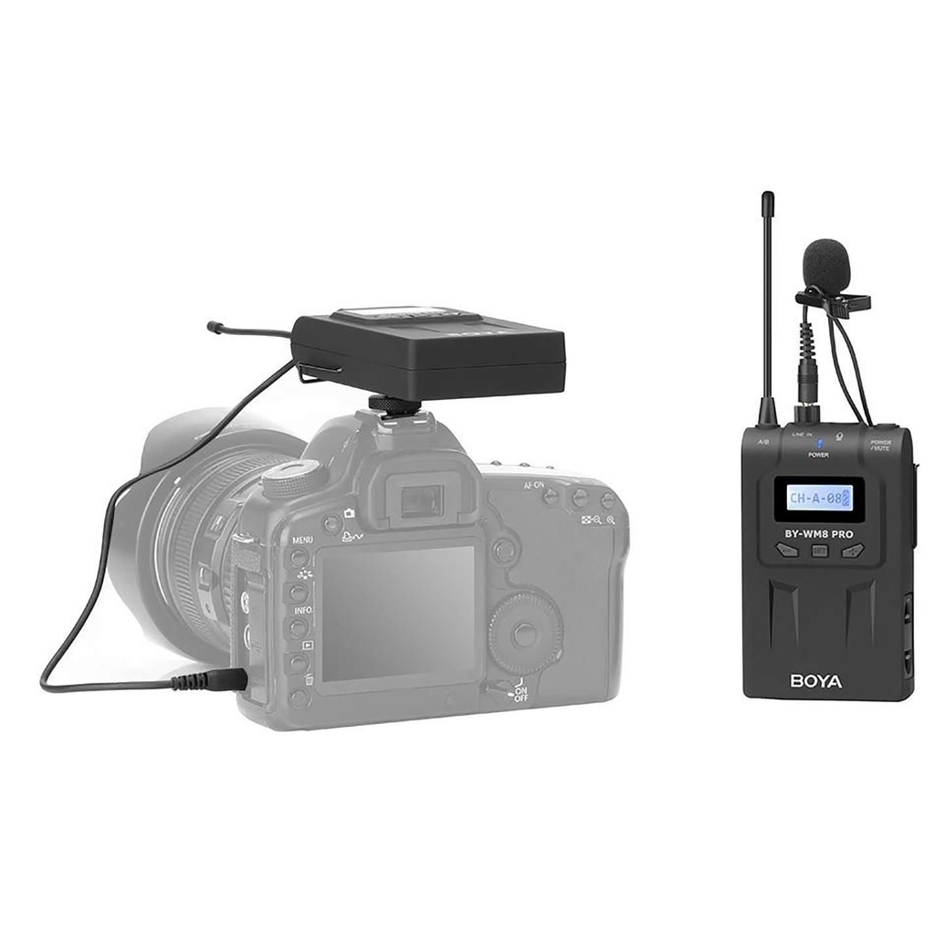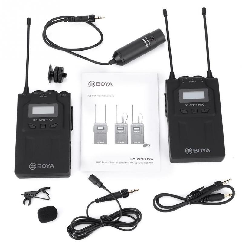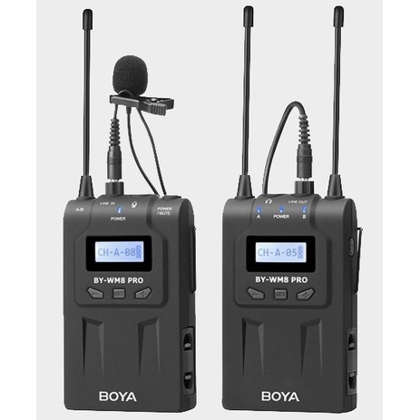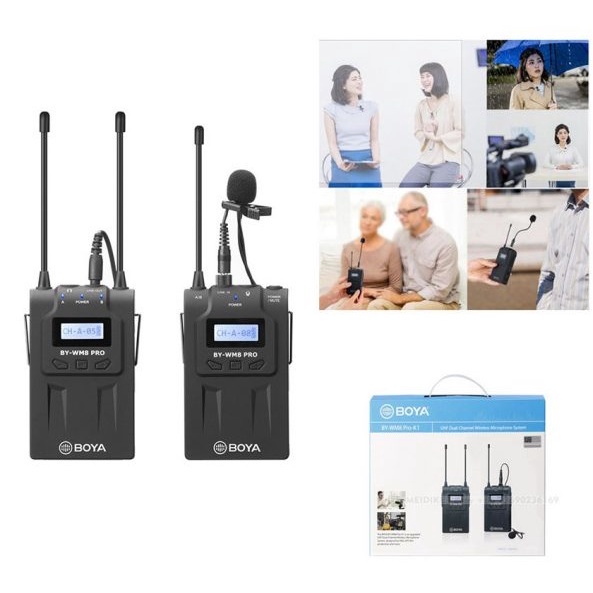 - Boya BY-WM8 Pro-K1 là một hệ thống micro kép không dây sử dụng tần sóng UHF vô cùng chuyên nghiệp và tiện lợi. Với thiết kế cho ENG, EFP,DSLR video, và dual-Channel có thể làm việc cùng lúc với cả hai máy phát.Micro Boya này sử dụng lên đến 48 kênh sóng UHF cùng nhiều dải tần riêng biệt, đảm bảo không trùng sóng và hoàn toàn loại bỏ hoàn toàn nhiễu tín hiệu. Ngoài ra,Microphone thu âm này còn có thời gian thu phát trực tiếp lên tới 6h liên tục chỉ với 2 viên pin tiểu AA, UHF Wireless Microphone Boya BY-WM8 Pro-K1 sẽ là một sản phẩm hoàn hảo dành cho bạn.